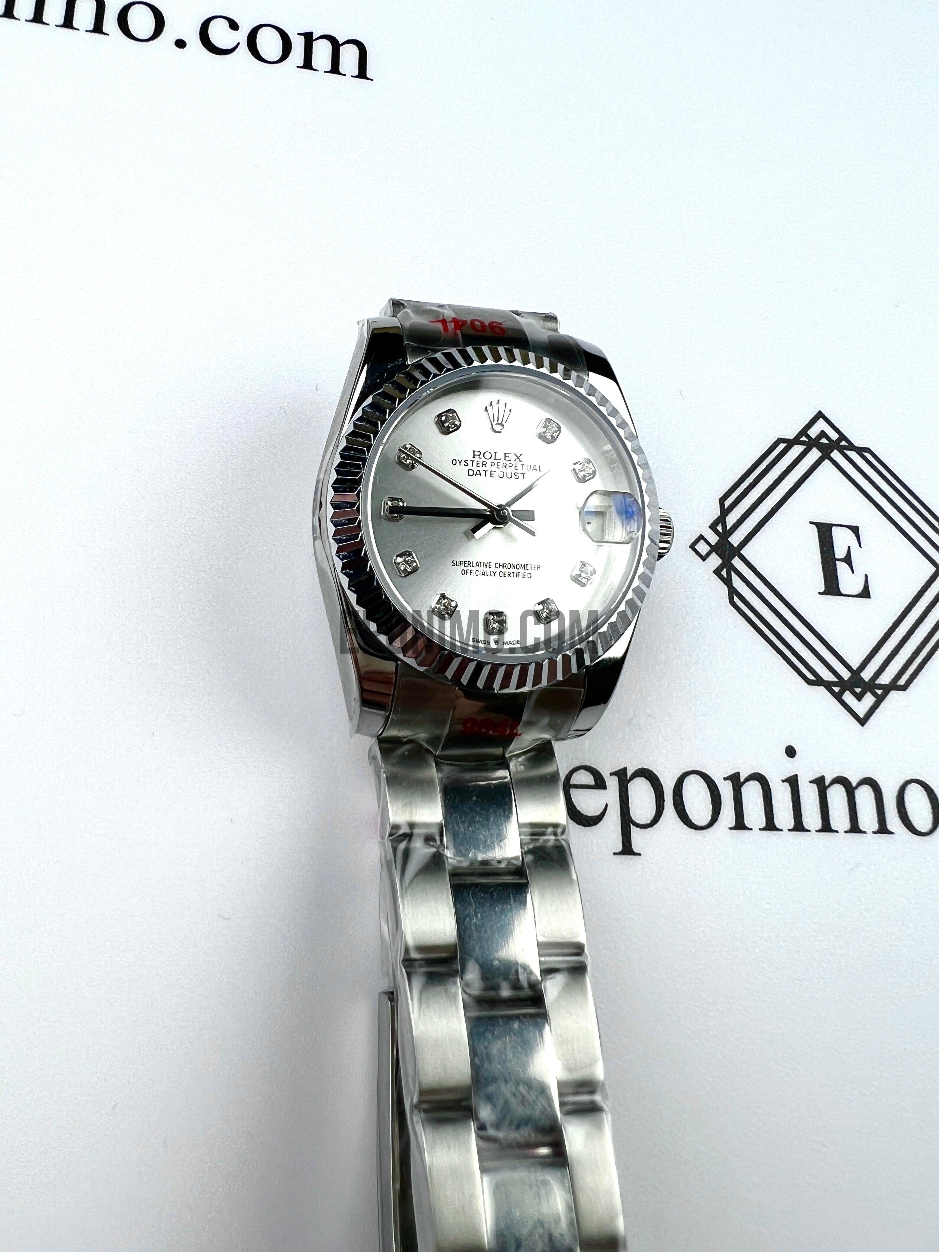 Με 31 χιλιοστά διάμετρο, γυναικείο, κατασκευασμένο εξ'ολοκλήρου από συμπαγές ανοξείδωτο ατσάλι. Φοράει αντιχαρακτικό κρύσταλλο ζαφειρίου και αυτόματο μηχανισμό. Αδιάβροχο.