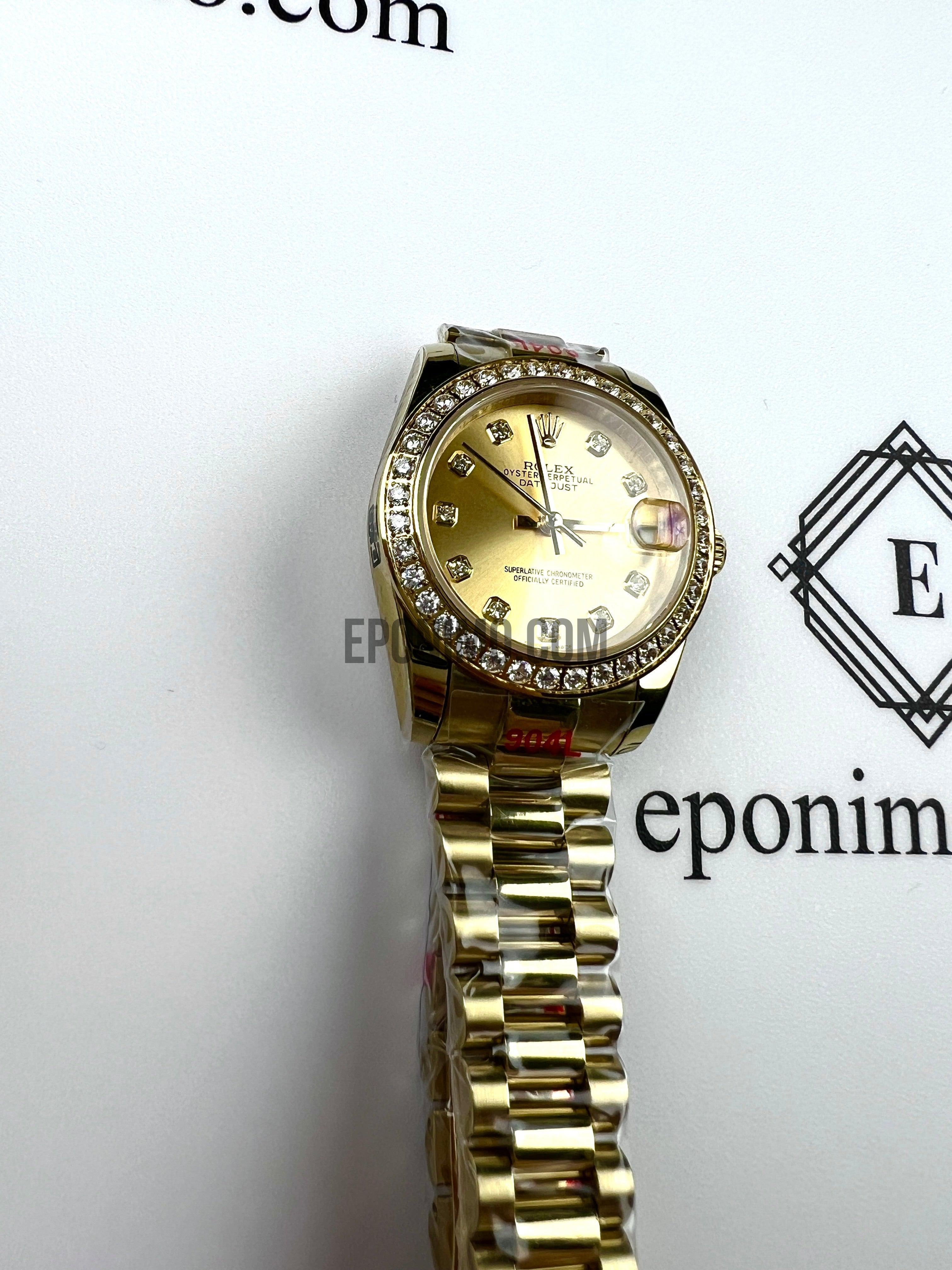 Με 31 χιλιοστά διάμετρο, γυναικείο, κατασκευασμένο εξ'ολοκλήρου από συμπαγές ανοξείδωτο ατσάλι. Φοράει αντιχαρακτικό κρύσταλλο ζαφειρίου και αυτόματο μηχανισμό. Αδιάβροχο.